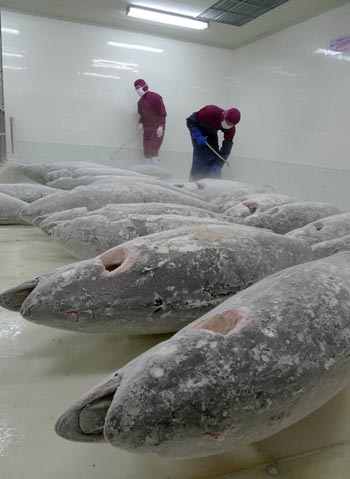 “過去外捕外銷也有無奈之處,”上海水產(chǎn)集團(tuán)有關(guān)人士介紹說。以金槍魚為例,供生食的金槍魚主要通過延繩釣的方式捕獲,隨后馬上要放血加工,然后放進(jìn)冷海水庫冰鮮保存或進(jìn)入零下55℃的超低溫冷庫冷凍。而國(guó)內(nèi)超低溫冷鏈缺乏,外銷也就成了無奈之舉。冷庫設(shè)備
